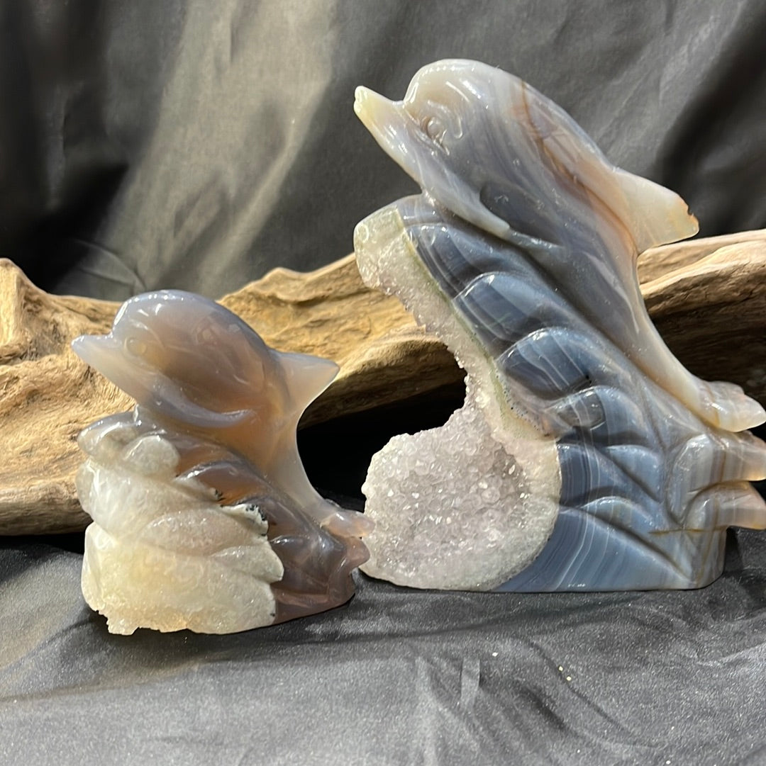 Druzy agate carved into dolphin shapes
