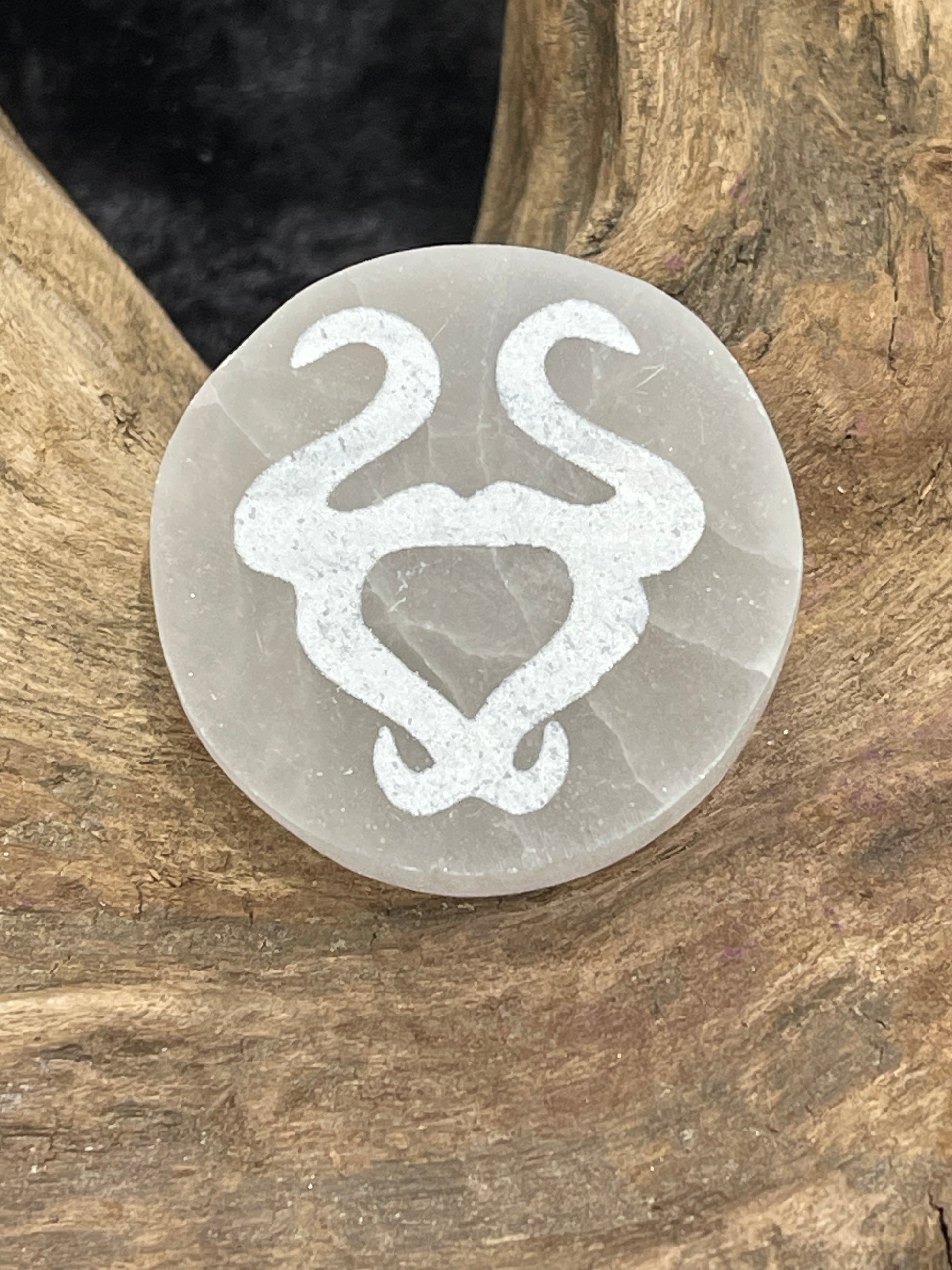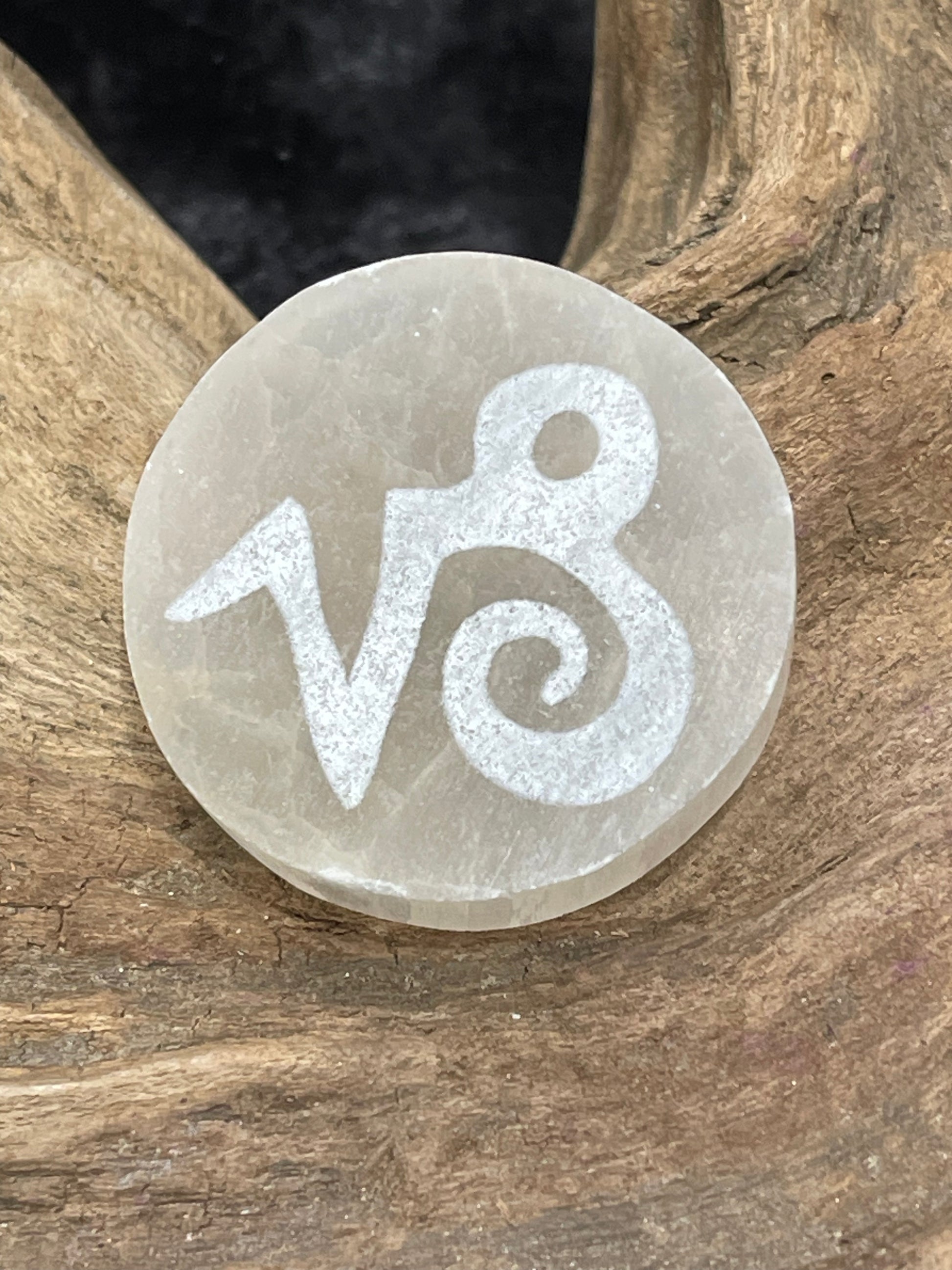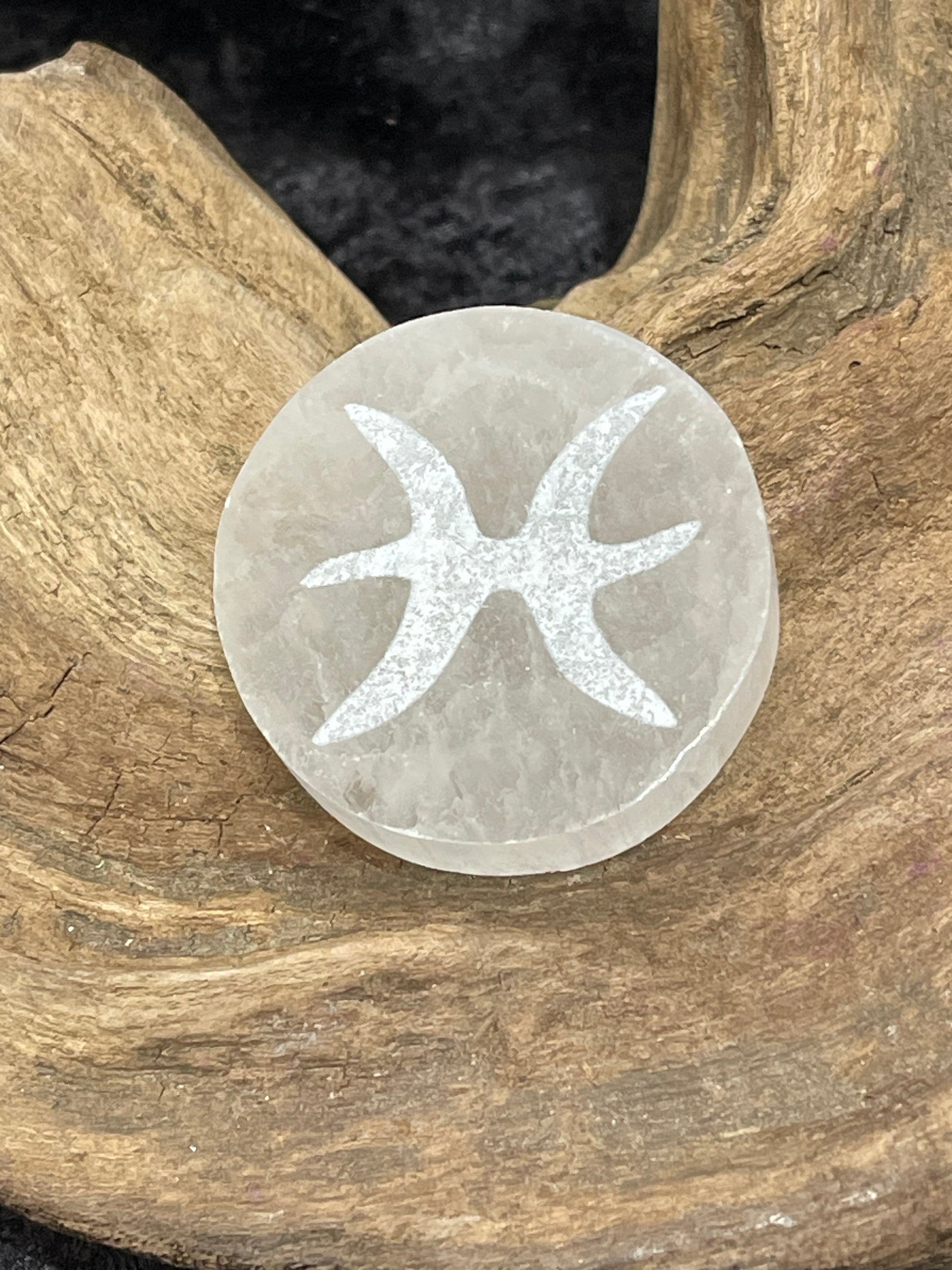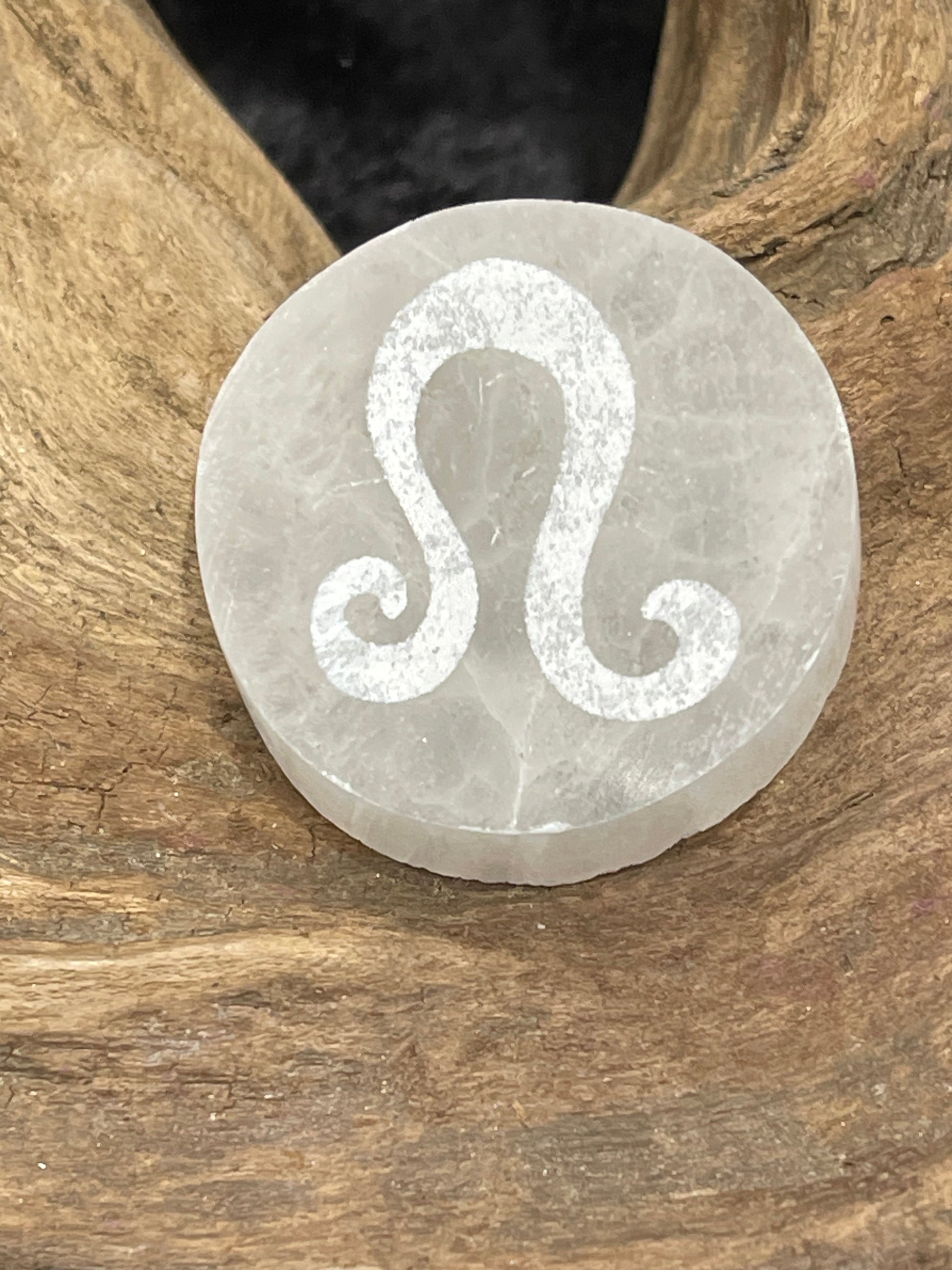 1.5” selenite disks engraved with zodiac symbols.